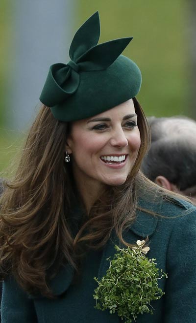 The Duchess of Cambridge smiles as she adjusts her hair during a visit to the 1st Battalion Irish Guards. (AP)